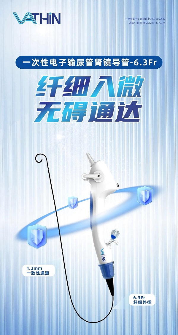 從產(chǎn)品優(yōu)勢角度出發(fā),以“一次性電子輸尿管腎鏡導(dǎo)管-6.3Fr”為例,基于約2.1mm的超細(xì)鏡體,能夠輕松通過狹窄輸尿管,進(jìn)而顯著降低輸尿管黏膜損傷風(fēng)險。此外,通過搭配9fr的導(dǎo)引鞘,以降低鏡體擺動導(dǎo)致的鞘管移位風(fēng)險,穩(wěn)定灌注流量(≥40ml/min),維持清晰術(shù)野。