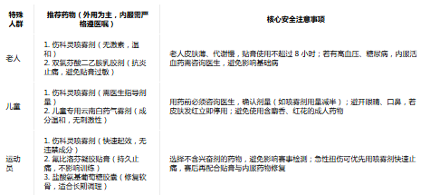 外用:傷科靈噴霧劑(1 小時內(nèi)噴藥,快速滲透)、云南白藥氣霧劑紅瓶(緊急鎮(zhèn)痛,48 小時內(nèi)使用)