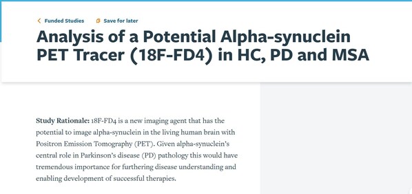 本次 MJFF基金資助的研究旨在驗證新型α-synPET分子示蹤劑18F-FD4的人體有效性,由基金會承擔在美國臨床研究相關(guān)的注冊及開發(fā)費用,研究將納入包括健康人、PD患者和MSA患者在內(nèi)的數(shù)十名受試者,接受18F-FD4注射后的PET掃描,并由合作伙伴XingImaging公司利用其專業(yè)的圖像分析流程進行處理,判斷18F-FD4是否在相關(guān)病理腦區(qū)產(chǎn)生顯著信號增強,并將進一步探索臨床縱向研究,評估其與臨床癥狀的相關(guān)性及對疾病進展的敏感性,為實現(xiàn)PD等疾病的精準診斷和療效監(jiān)測奠定基礎(chǔ)。